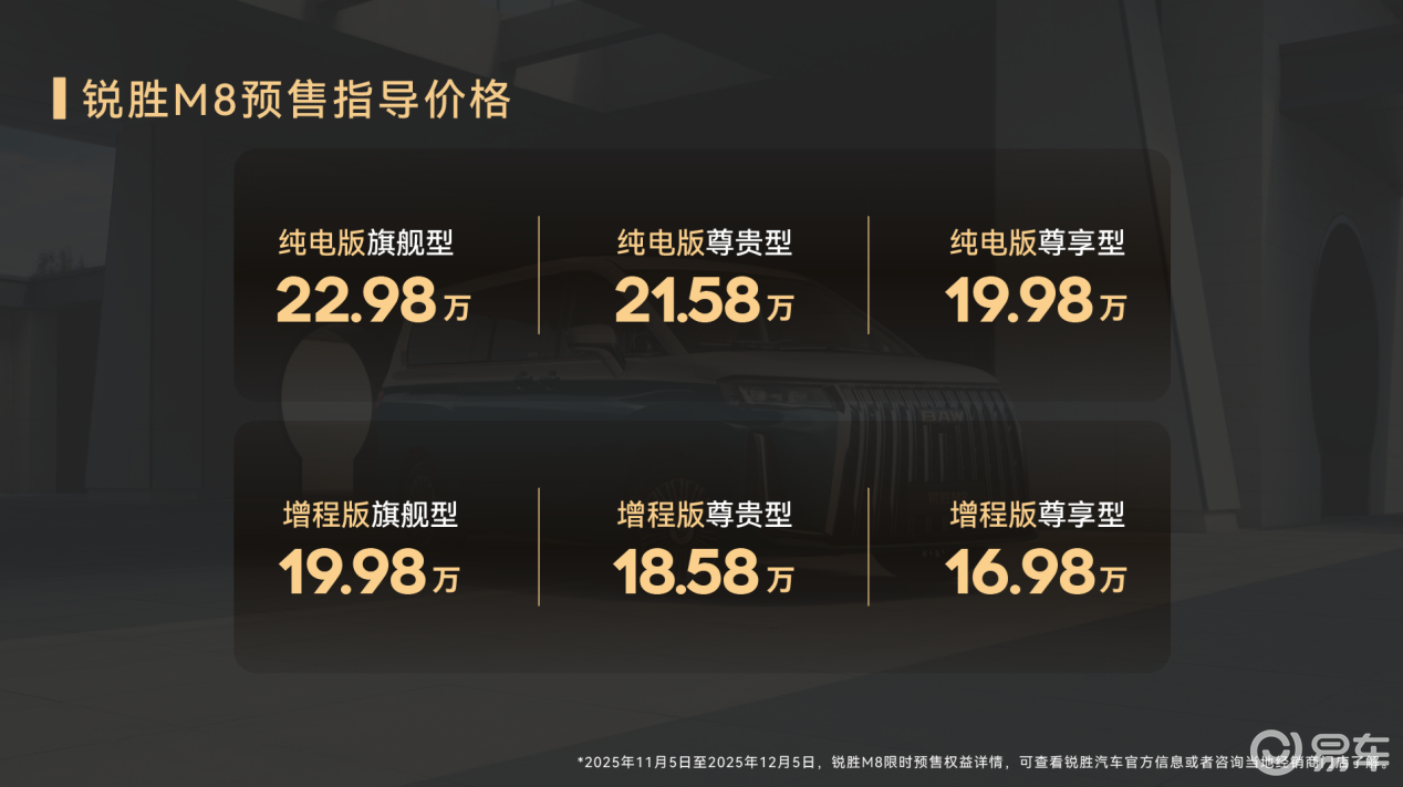 锐胜M8 增程版10分钟补能50%; EV版20分钟补能60%;集成式电机电控,输出功率达170kW,轮端最大扭矩3500N·m。